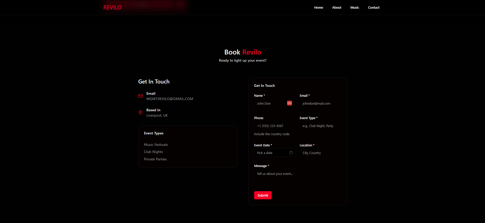 Another key challenge was helping improve the experience of booking. Revilo’s site integrates Resend with React-email templates to send beautifully designed emails to the DJ's inbox detailing user-submitted emails for bookings and events.